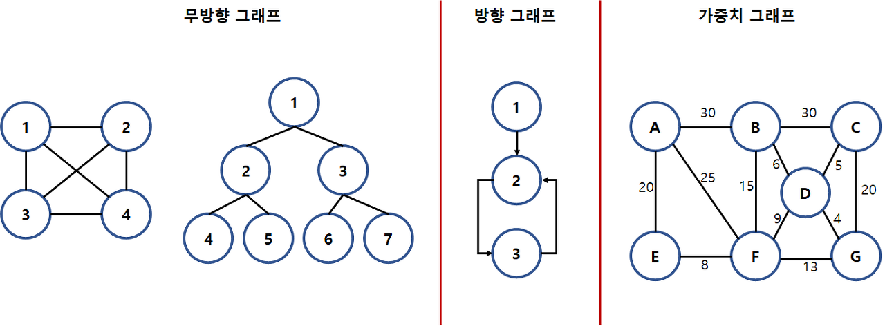 그래프의 종류에는 간선이 방향성을 가지는 지에 따라 방향 그래프(directed graph)와 무방향 그래프(undirected graph)로 구분할 수 있으며, 간선이 단순 연결 이상의 정보(이를 가중치라 한다.)를 가지는 가중치 그래프(weighted graph)*도 있다.