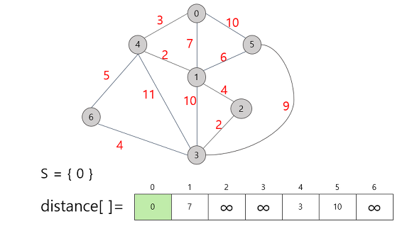 다익스트라 알고리즘(dijkstra algorithm)은 하나의 시작 정점에서 다른 정점까지의 최단 경로를 구하는 알고리즘으로 무방향 그래프, 방향 그래프 모두 적용 가능하다. 기본 원리는 시작 정점에서 가장 가까운 정점을 선택하여 추가하면서 추가된 모든 정점에 대한 최단 경로를 구해가는 과정이다. 아래의 그래프를 이용해 구현해보자.