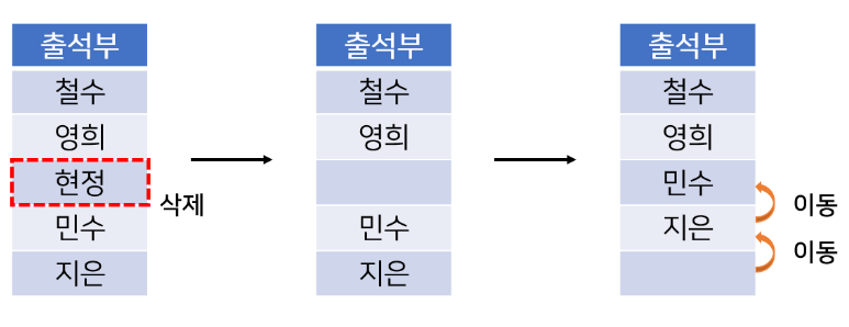 삽입과 마찬가지로 원소를 어디에서 삭제하냐에 따라 시간이 달라진다. 맨 끝의 데이터를 삭제할 경우 O(1)이지만, 처음이나 중간이라면 모든 데이터를 이동해야 하기에 O(n)이 걸린다.